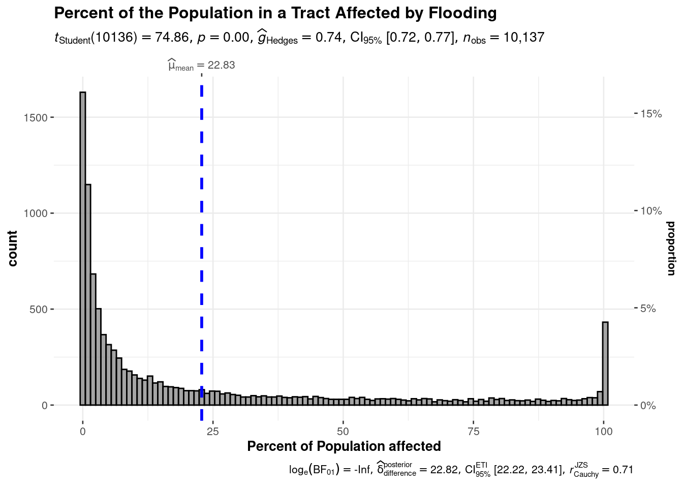 foo <- df %>%select(TRACTFIPS, POPULATION, CFLD_EXPP) %>%mutate(Pop_diff=(POPULATION - CFLD_EXPP)/POPULATION) %>%filter(Pop_diff>0) %>%filter(Pop_diff<1) %>%mutate(Pct_effected=CFLD_EXPP*100/POPULATION) ggstatsplot::gghistostats(data=foo,x=Pct_effected,xlab ="Percent of Population affected",title ="Percent of the Population in a Tract Affected by Flooding",subtitle ="After elimination of unrealistic values")