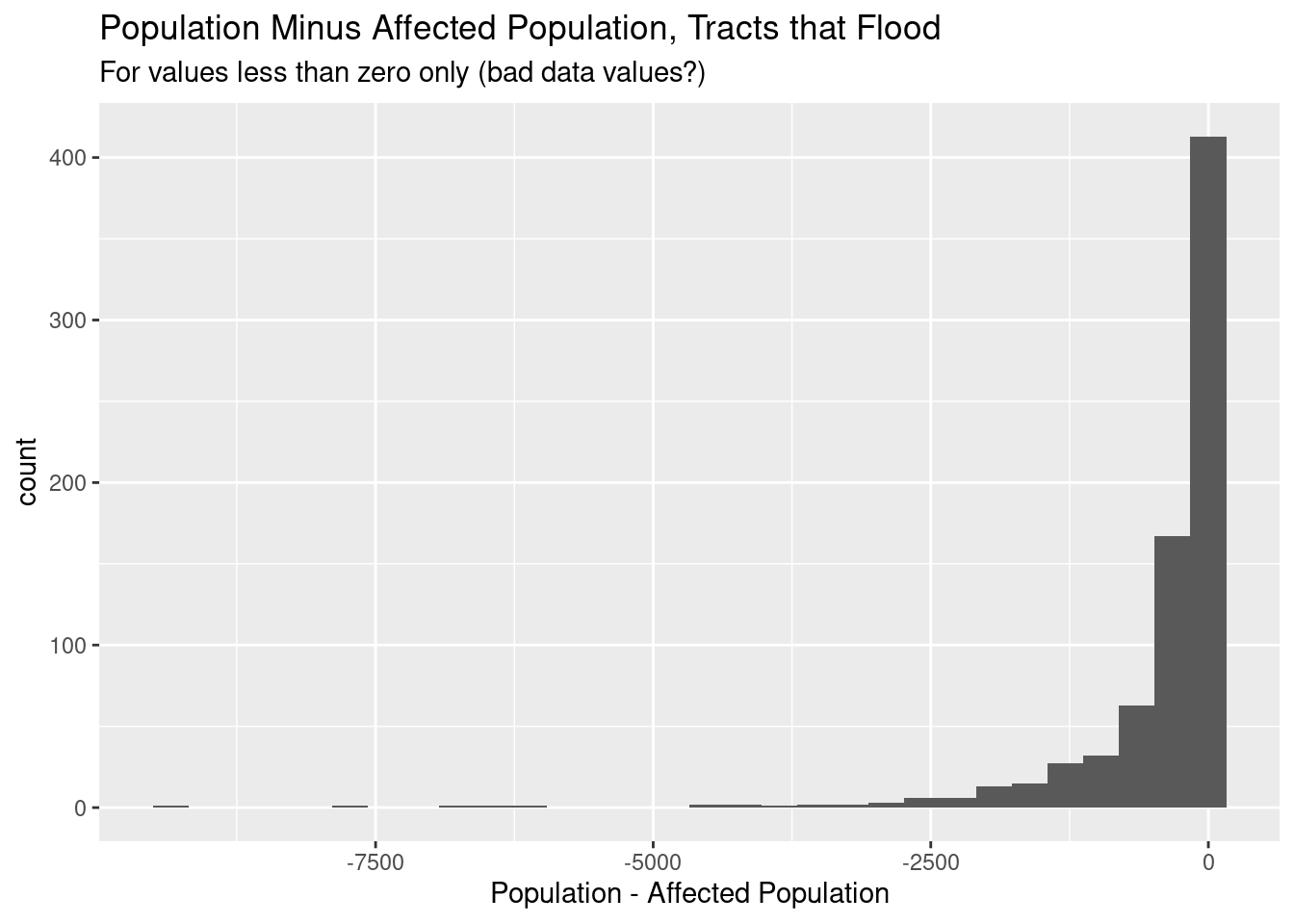 df %>%select(TRACTFIPS, POPULATION, CFLD_EXPP) %>%mutate(Pop_diff=POPULATION - CFLD_EXPP) %>%filter(Pop_diff<0) %>%ggplot(aes(x=Pop_diff)) +geom_histogram() +labs(title="Population Minus Affected Population, Tracts that Flood",subtitle="For values less than zero only (bad data values?)",x="Population - Affected Population")