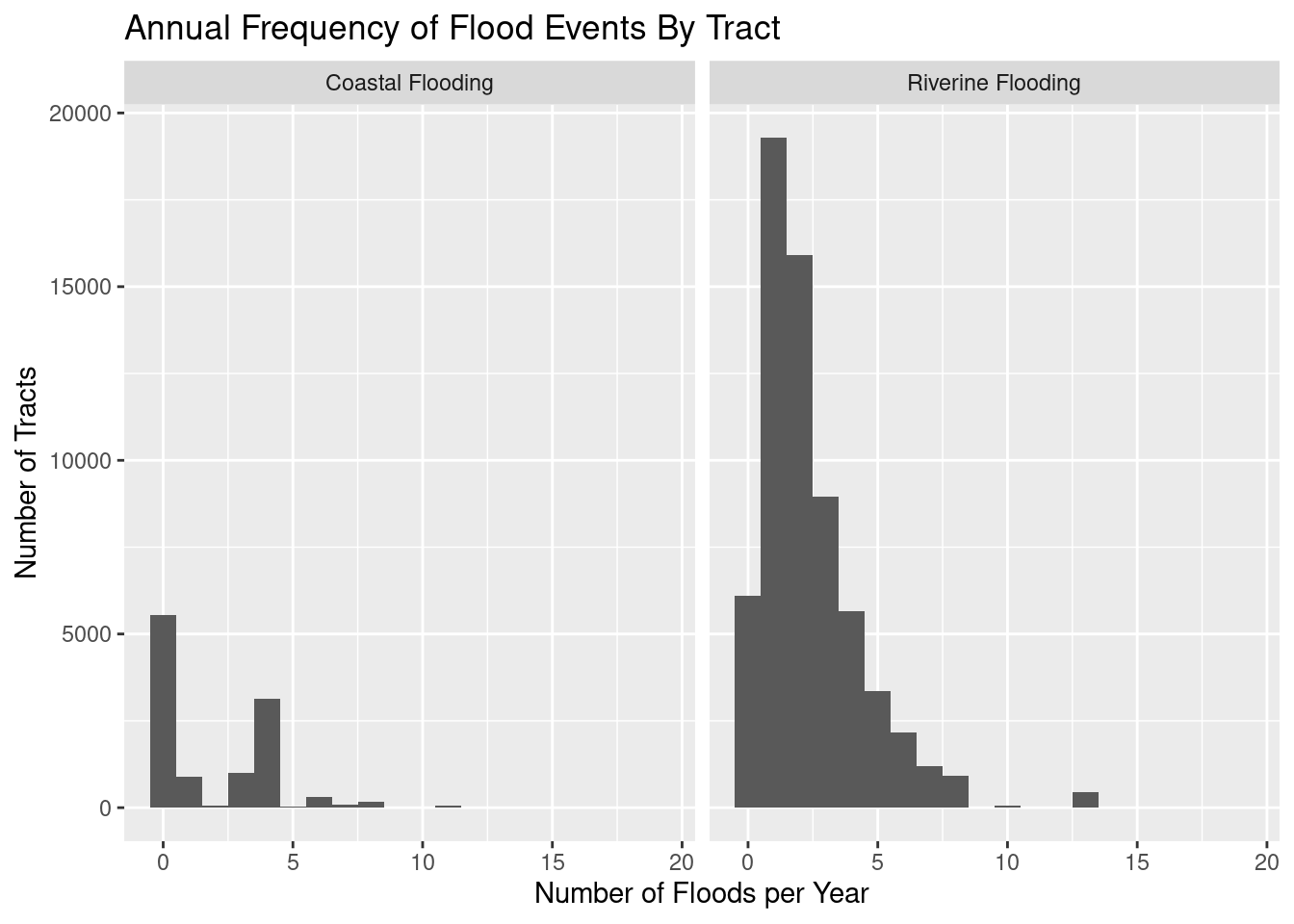 facet_labels <-c("Coastal Flooding", "Riverine Flooding")names(facet_labels) <-c("CFLD_AFREQ", "RFLD_AFREQ")df %>%select(TRACTFIPS, ends_with("AFREQ")) %>%# ends_with("EXPP")) %>% pivot_longer(!TRACTFIPS, names_to="Variable", values_to="Values") %>%filter(str_detect(Variable, "FLD")) %>%filter(!is.na(Values)) %>%filter(Values>0) %>%mutate(Variable=as.factor(Variable)) %>%ggplot(aes(x=Values)) +geom_histogram(binwidth=1) +facet_wrap(~Variable, labeller=labeller(Variable = facet_labels)) +labs(title="Annual Frequency of Flood Events By Tract",x="Number of Floods per Year",y="Number of Tracts")