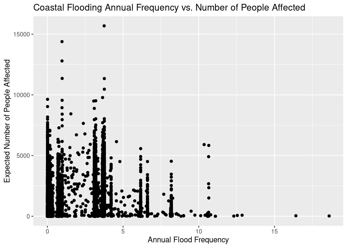# Coastal Flooding vs # People affecteddf %>%filter(!is.na(CFLD_AFREQ)) %>%filter(CFLD_AFREQ>0) %>%ggplot(aes(x=CFLD_AFREQ, y=CFLD_EXPP)) +geom_point() +labs(title="Coastal Flooding Annual Frequency vs. Number of People Affected",y="Expected Number of People Affected",x="Annual Flood Frequency" )