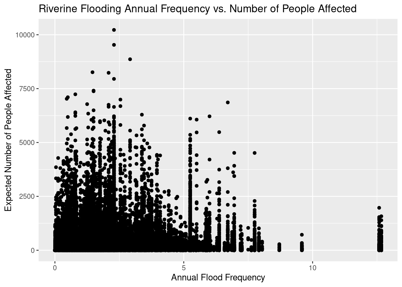 # Riverine Flooding vs # People affecteddf %>%ggplot(aes(x=RFLD_AFREQ, y=RFLD_EXPP)) +geom_point() +labs(title="Riverine Flooding Annual Frequency vs. Number of People Affected",y="Expected Number of People Affected",x="Annual Flood Frequency" )