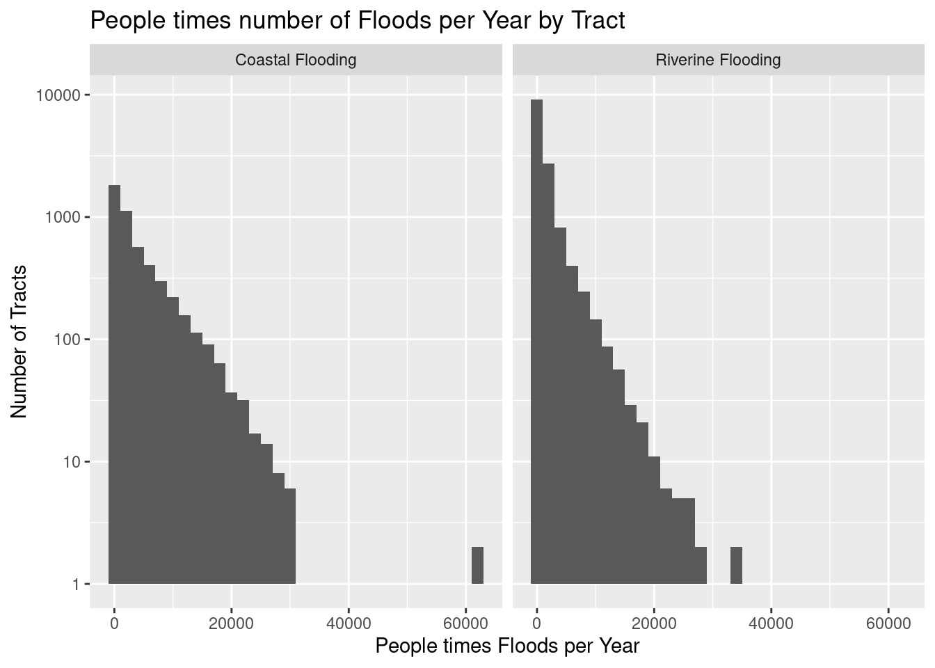 # Expected number of people affected annually (# people times # floods)facet_labels <-c("Coastal Flooding", "Riverine Flooding")names(facet_labels) <-c("CFLD", "RFLD")df %>%select(TRACTFIPS, CFLD_AFREQ, CFLD_EXPP, RFLD_AFREQ, RFLD_EXPP) %>%filter(CFLD_AFREQ+RFLD_AFREQ>0.5) %>%pivot_longer(!TRACTFIPS, names_to=c("Flood", ".value"), names_pattern="(.*FLD).*(AFREQ|EXPP)",values_drop_na =TRUE,values_to="Values") %>%mutate(Annual_effect=AFREQ*EXPP) %>%filter(Annual_effect>100) %>%ggplot(aes(x=Annual_effect)) +geom_histogram(binwidth =2000) +scale_y_log10() +# facet_wrap(~Flood) +facet_wrap(~Flood, labeller=labeller(Flood = facet_labels)) +labs(title="People times number of Floods per Year by Tract",x="People times Floods per Year",y="Number of Tracts")
